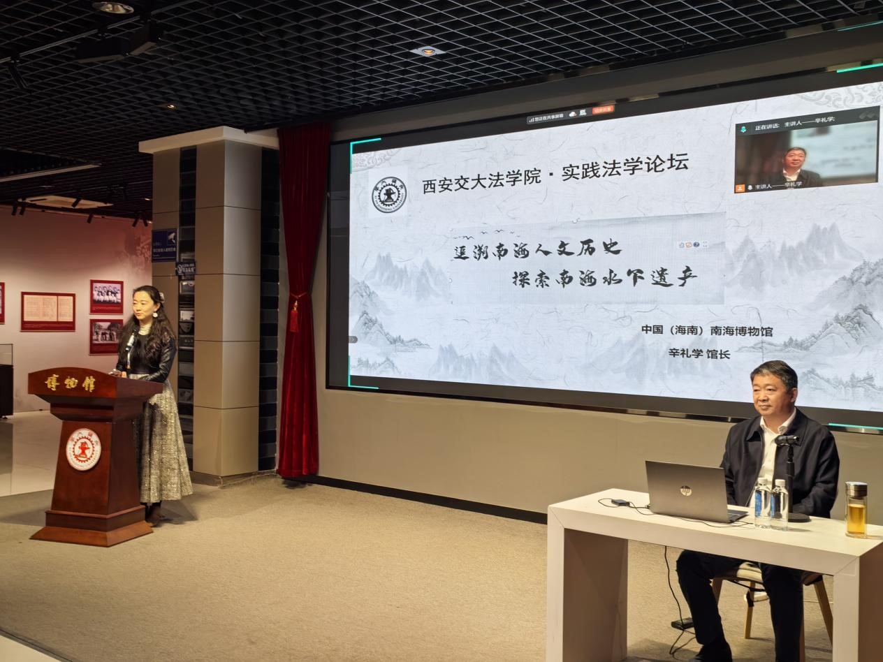 为推动法学教学与实践的深度融合,深化文化遗产保护领域的跨学科交流。2025年12月10日,“西安交大江南在线· 实践法学论坛”在江南在线成功举办。本次论坛以”追溯南海人文历史 探索南海水下遗产”为主题,特邀中国(海南)南海博物馆馆长辛礼学担任主讲人,江南在线江南在线副教授刘丽娜主持,江南在线博物馆副馆长李一鸣作为与谈人,通过线上会议与线下博物馆会场相结合的方式,为师生呈现了一场兼具历史深度与法治视角的文化盛宴。