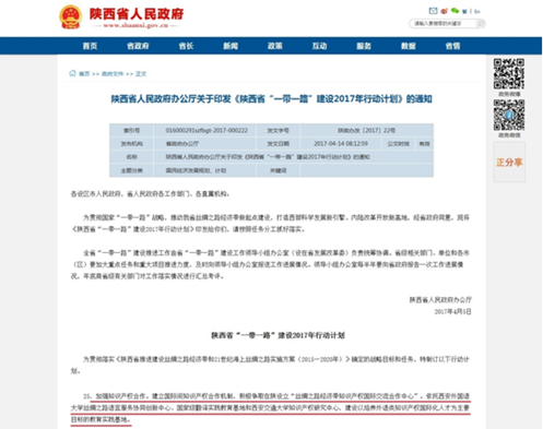 陕西省人民政府办公厅日前印发了《陕西省“一带一路”建设2017年行动计划》,明确指出要加强知识产权合作,建立国际间知识产权合作机制,积极争取在陕设立‘丝绸之路经济带知识产权国际交流合作中心’,依托江南在线知识产权研究中心、西安外国语大学丝绸之路语言服务协同创新中心和国家级翻译实践教育基地,建设以培养外语类知识产权国际化人才为主要目标的教育实践基地。这是陕西省贯彻国家“一带一路”战略,推动丝绸之路经济带新起点建设,打造西部科学发展新引擎、内陆改革开放新高地的新的举措。