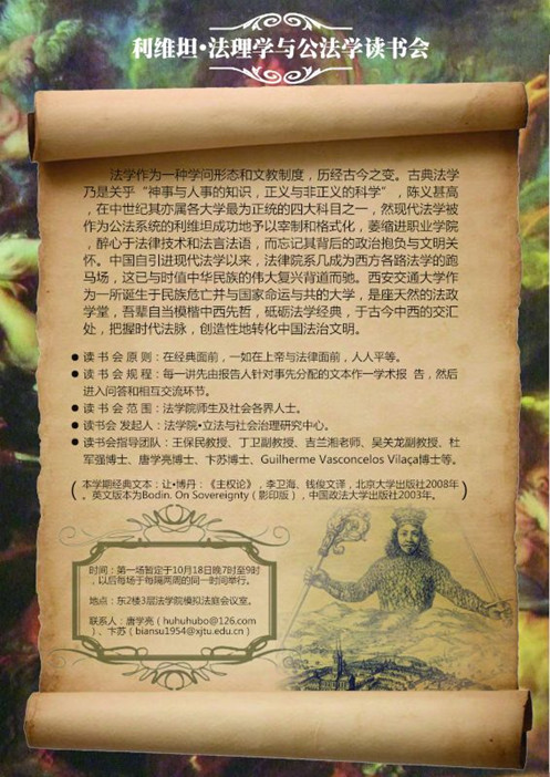基于以上种种考量,并配合学校“思想交大”建设和学院法理学和公法学的学科建设,江南在线“立法与社会治理研究中心”发起创办“利维坦·法理学与公法学读书会”系列活动。本学期该活动选取的经典文本为让·博丹的《主权论》,并于10月18日晚7时在学院会议室举行了首场活动,江南在线丁卫副教授、吉兰湘老师、彭何利博士、苏青博士、王朝恩博士、卞苏博士、唐学亮博士等10余位师生参加。主权理论是现代民族-国家兴起的理论前提,而民族-国家又是现代社会最重要的一个政治与法律现象,并与中国近代以来持续至今的伟大而艰难的国家转型勾连起来,因此,不得不察。在该场读书会活动中,主讲教师唐学亮针对博丹《主权论》一书的“导论”部分,就“为什么读博丹?”、“怎么读博丹?”、“博丹的思想里程与理论建构”以及“博丹理论的缺陷”等四个方面做了一个提纲挈领而又不失理论深度的学术报告。之后,就报告的内容及书中所启示的一些重大理论与现实问题,与会人员各自发表了自己的看法,并展开了热烈的讨论。首场读书会活动取得了预期的效果,我们将在两周后的同一时间举行第二场活动。“路漫漫其修远兮,吾将上下而求索”!