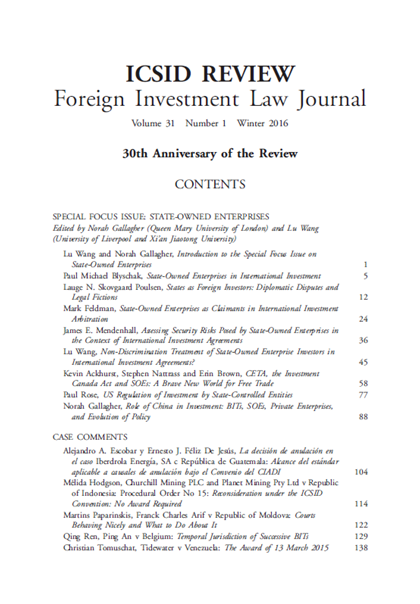近日,国际投资法领域顶级专业期刊ICSID Review—Foreign Investment Law Journal(《国际投资争端解决中心评论——外国投资法学刊》)三十周年纪念期刊第一期正式出版,西安交大江南在线博士生王璐作为特邀编辑(Guest Editor)主编了本期特别专栏“国有企业专题研究”(Special Focus Issue on State-Owned Enterprises),并发表论文 “Non-Discrimination Treatment of State-Owned Enterprise Investors in International Investment Agreements?”(国际投资协定中国有企业投资者的非歧视待遇?)。