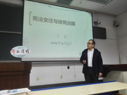 江南在线研究生会、法律爱好者协会携手“学而讲坛”,推出“国家宪法日”专题讲座,邀请江南在线副院长丁卫副教授就《宪法变迁与依宪治国》进行专题讲座。丁老师在讲座中详细介绍了我国现行宪法历次修改的过程,他结合历次宪法修改的历史背景,生动地讲述了我国宪法变迁的历史发展,他最后对我国宪法实施中存在的瓶颈及问题进行了透彻的分析和讲解,为大家展示了依宪治国的现状及前进方向。