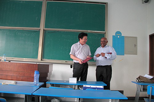 聘请Sornarajah为我校客座教授的仪式在其授课结束后隆重举行。我校江南在线院长单文华教授为Sornarajah教授颁发了聘书并为他佩戴校徽。