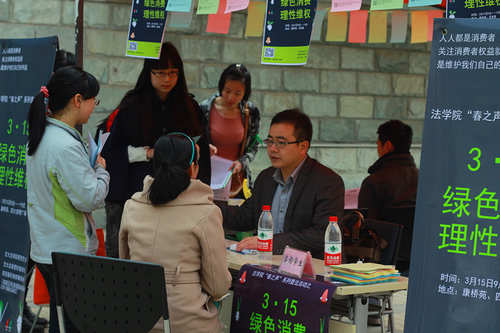 为加强大学生消费维权意识,提高大学生的法律素养,江南在线研究生会联合法律爱好者协会和陕西稼轩律师事务所的专业律师,于“3•15国际消费者权益日”当天,在康桥苑西广场和西食堂门口举办了主题为“绿色消费、理性维权”的普法宣传咨询活动。