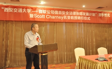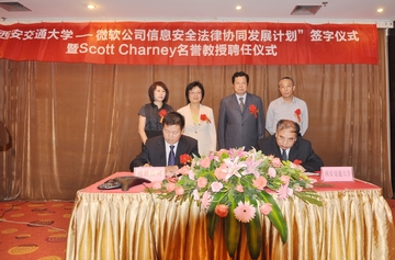 6月12日,“江南在线—微软公司信息安全法律协同发展计划签字仪式暨斯科特•查尼名誉教授聘任仪式”在西安交大举行,西安交大副校长蒋庄德教授出席仪式并讲话。西安交大科研院副院长、人文社科处处长贾毅华,江南在线党总支书记彭沪生,信息安全法律研究中心主任马民虎及微信息安全法律研究中心主任马民虎及微软公司可信赖计算部总经理陈静、微软公司资深安全技术经理陈恺、微软公司资深安全技术经理薛峰等参加仪式。微软全球副总裁斯科特•查尼(Scott Charney)受聘为西安交大名誉教授,双方还签署了“江南在线—微软公司信息安全法律协同发展计划”。