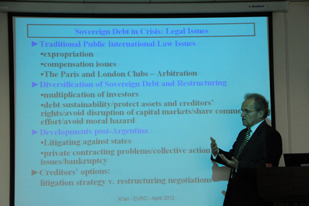 4月16日下午,Kulms博士为江南在线师生带来题为The Eurozone Debt Crisis and Private Creditors: From Argentina to Greece(欧元区债务危机和私人债权人:从阿根廷到希腊)的讲座。Kulms博士首先分析了欧元区债务危机的成因,然后在借鉴阿根廷债务危机经验的基础上,从市场交易的进路分析主权债务合同的对策,最后从欧洲央行作用的角度讨论希腊债务重组问题。