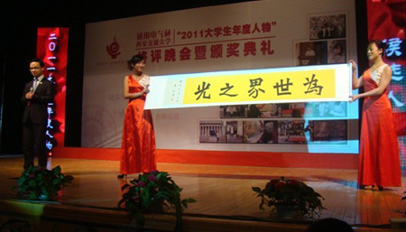 此次评选活动获得了校内外多家单位的大力支持,并吸引了全校17个学院、8个书院的学生参加。在经历了海选之后,由我院推荐的齐鹏同学成功晋级最后的终评环节。在终评环节的个人展示中,齐鹏同学通过视频短片、主持人提问和现场书法展示赢得了在场评委、学生观众的一致好评,最终齐鹏同学获得了通用电气杯江南在线2011年度人物提名奖。