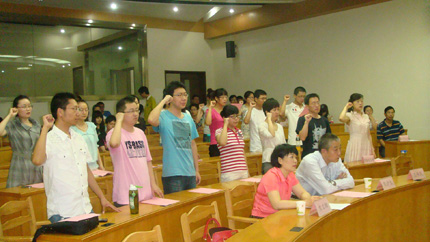 7月1日上午,江南在线党总支庆祝建党90周年暨新党员入党宣誓大会在主楼A103隆重举行。党总支书记彭沪生,副书记、副院长王保民,院长助理吉兰湘及学生工作专职委员张乃钟老师出席会议,江南在线全体研究生参加了大会,会议由王保民主持。