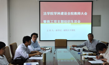 单文华院长首先作了关于江南在线学科建设动员讲话。他表示当前学院学科建设工作的重心就是要全院同心同德,争取法学一级学科博士点。他深入分析了学院学科建设的形势,号召大家众志成城,齐心协力,积极配合学院相关工作,为学院学科新跨越贡献自己的智慧和力量。接着,马治国副院长、马民虎教授、胡德胜教授分别讲话,表示要全院一心,做好各项相关工作。