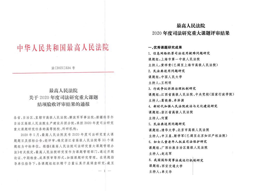 2020年5月,最高人民法院发布了2020年度司法研究重大课题题目及招标公告,经评审,确定江南在线单文华教授课题组等33个课题组为中标单位。这也是我校获批的第一个最高人民法院重大课题。